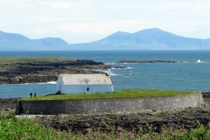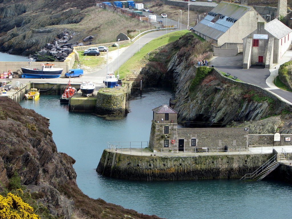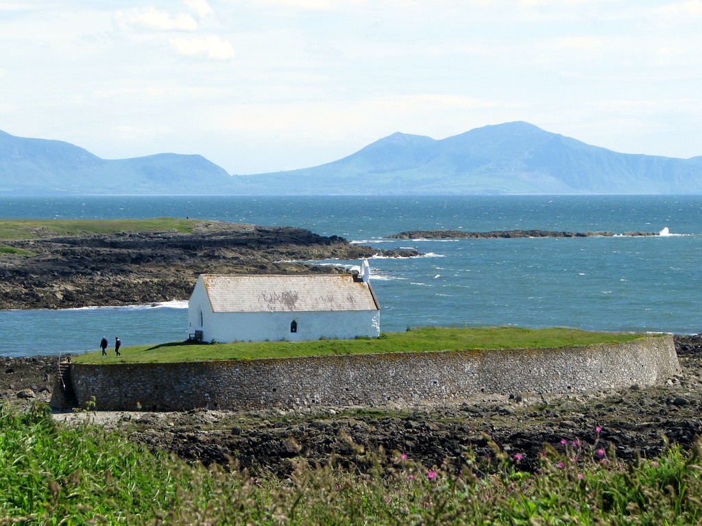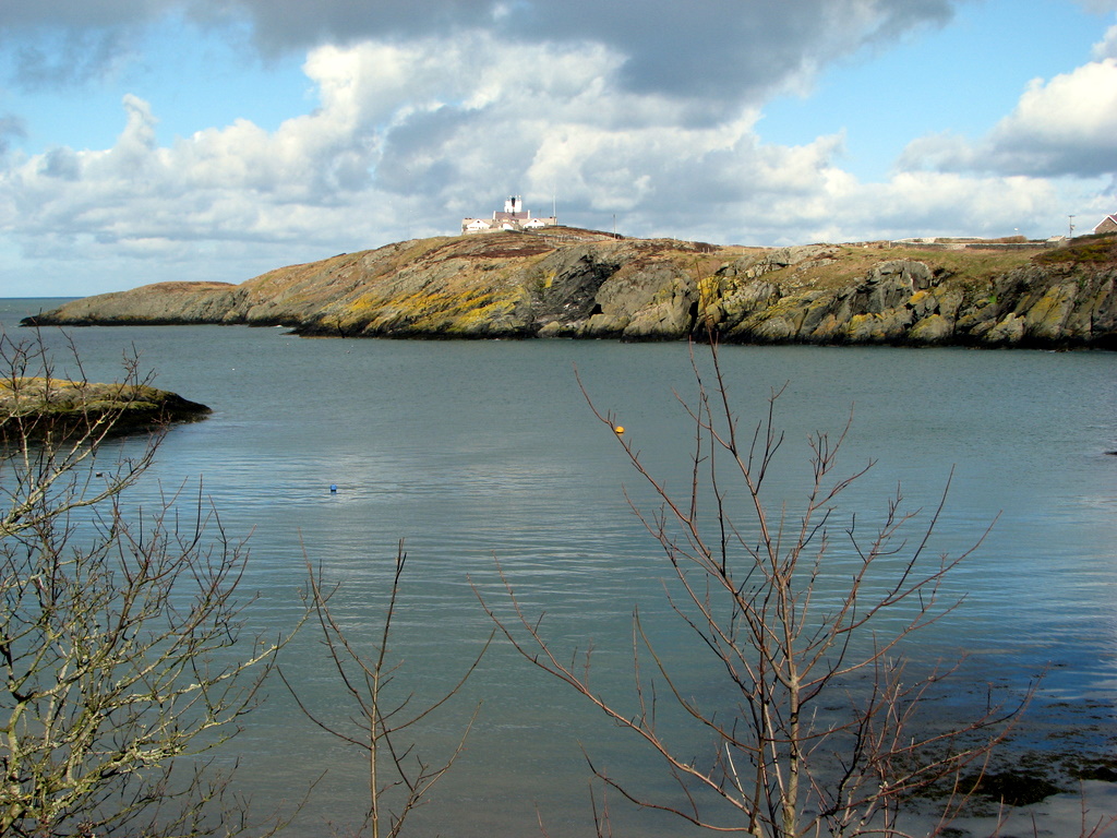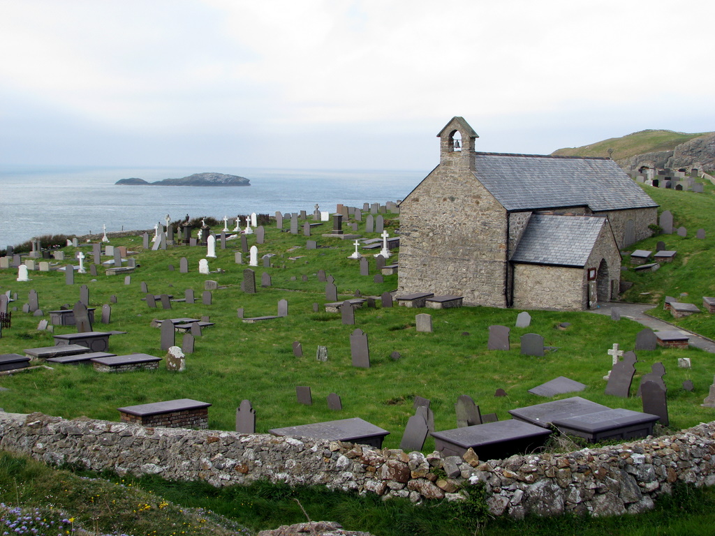 Cemaes Bay has a lovely harbour with many small craft coming and going. There are a few pubs and a restaurant there and ample car parking next to a sheltered beach suitable for bathing and fun. A short walk along the headland gets you to Llanbadrig Church pictured here, with great views towards the Skerries, small uninhabited islands off the coast with a prominent lighthouse.